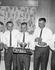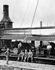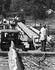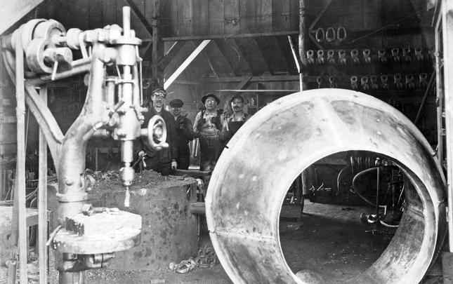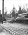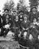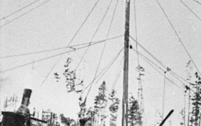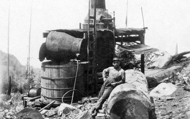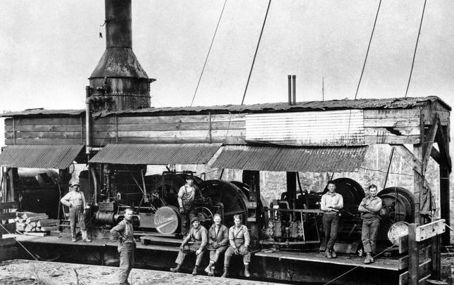 A 10 x 12 Washington 4 drum tyler steam donkey. Left to right: Lars Lovick (chaser), Tony Johnson (dog up man), Gust Halverson (engineer), Hans Bendickson (owner), and unknown man is the fireman.