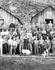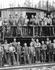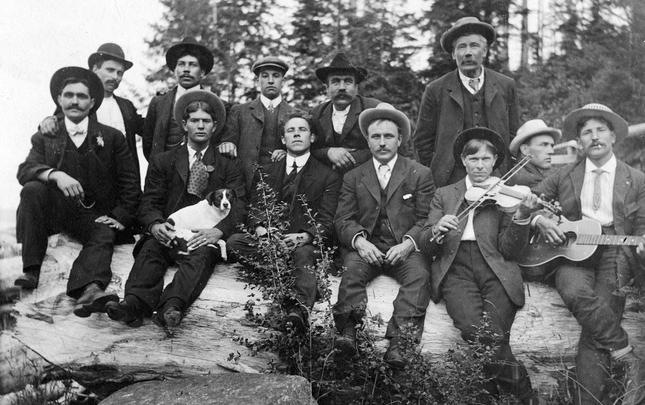 P.B. Anderson logging crew on the front steps of the camp bunkhouse likely at the Knox Bay camp on Thurlow Island. Charlie Mould is second from left in front row