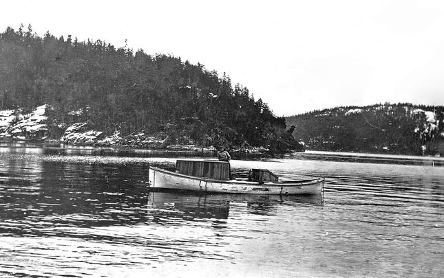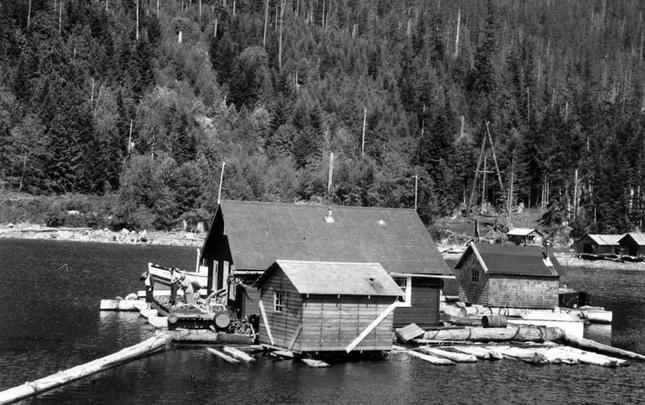 G.H. 'Doc' Gildersleeve operated a small logging camp at various locations. According to Ken Drushka's book, Working in the Woods he established the first truck logging camps on the mid-coast. This photograph taken when the camp was located at King Island.