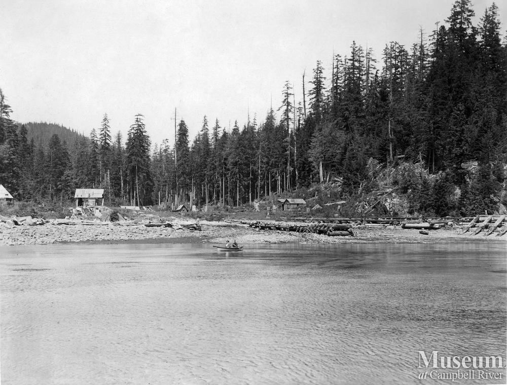 Abandoned camp of British Columbia Mills, Timber and Trading Co., form Launch 'Kalmor II', at anchor in west end of Nodales Channel, 130 miles northwest of Vancouver. A landing was made here to allow easy access to Surveyed Timber Limit 40772, owned by Clark and Lyford, Ltd.