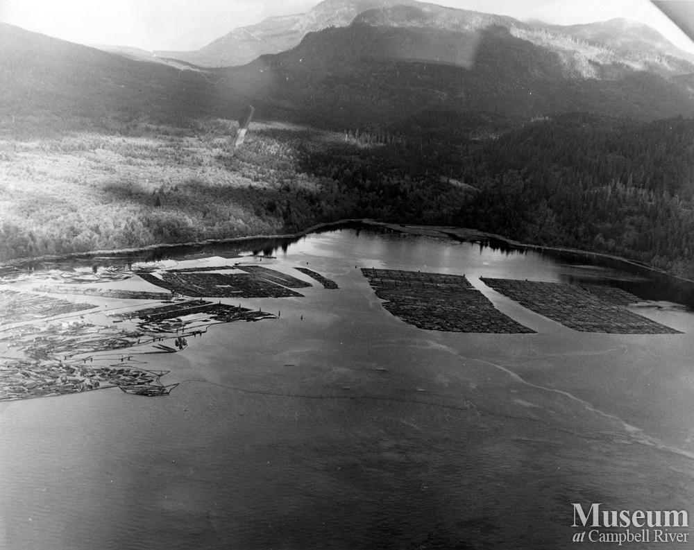 View of booming grounds and booms at MacMillan Bloedel operations at Menzie's Bay.