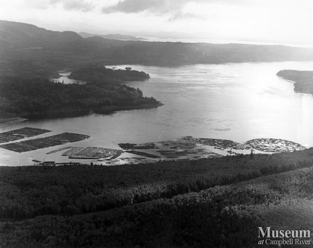 View of booming grounds and booms at MacMillan Bloedel operations at Menzie's Bay.