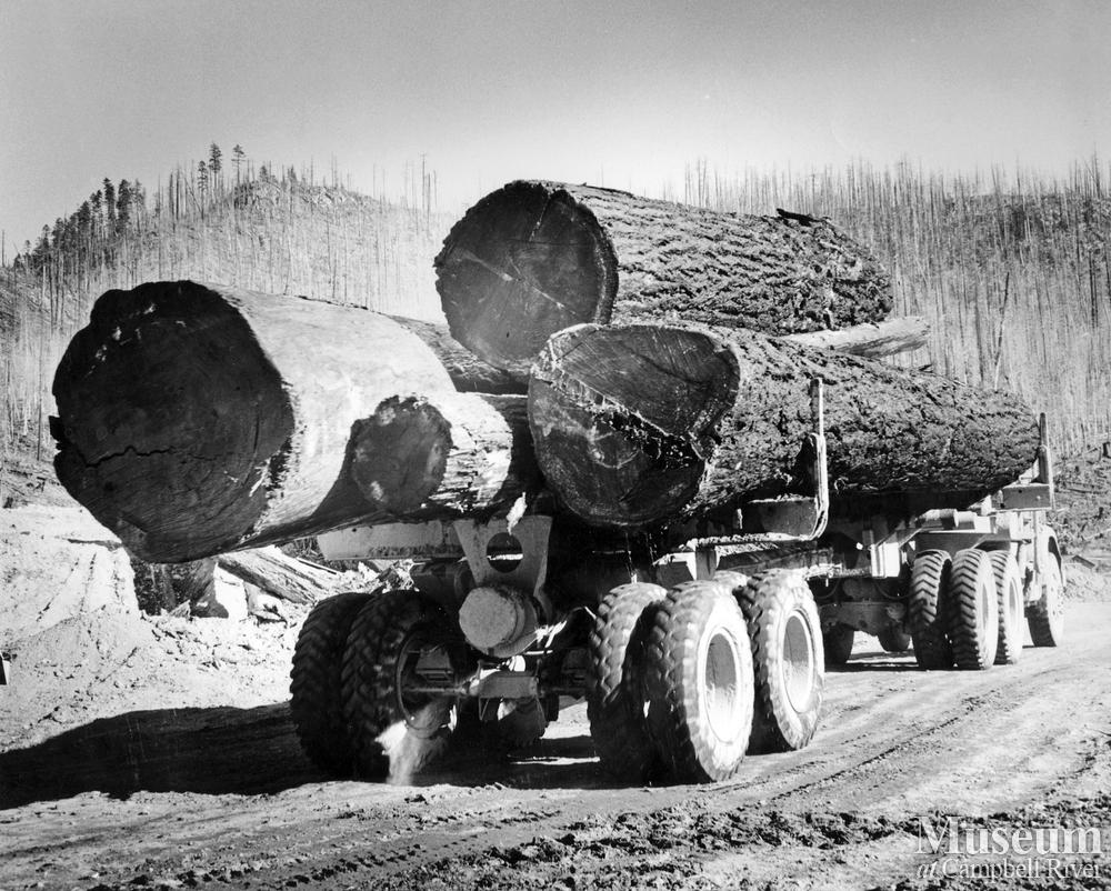 Loaded logging truck at Baikie Bros. Logging operations near Upper Campbell Lake.