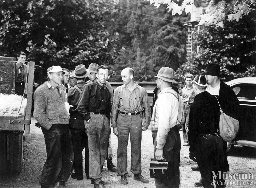 B.C. Forest Service fire fighting crew preparing to fight the Sayward Fire. This photograph is likely taken at Forbes Landing.