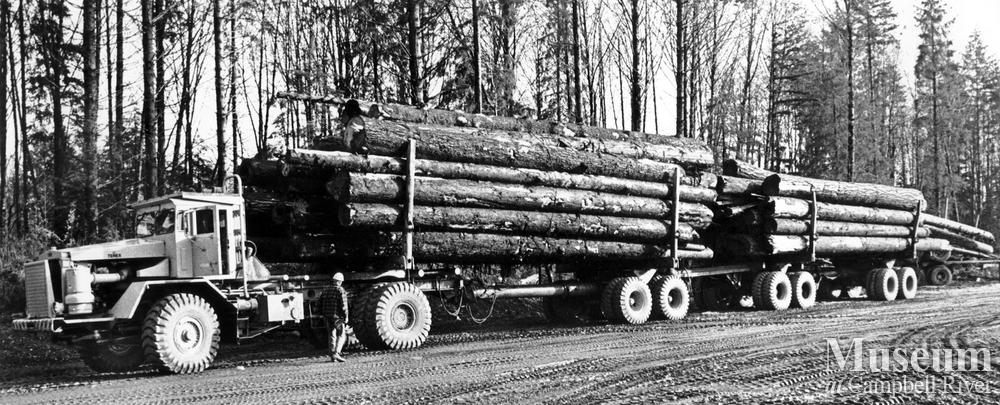 This was (at the time) the largest shipment of logs to ever be hauled by truck, MacMillan Bloedel operation at Menzie's Bay.