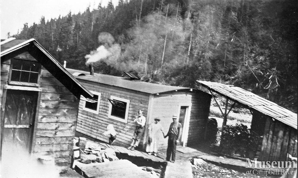The cookhouse with woodshed, commissary, and offices of the Bendickson Logging camp at Jervis Inlet (Patrick Point). The sidewalks were made from split cedar. Mr. and Mrs. Henry Whittaker holding hands in front of one of the camp buildings.