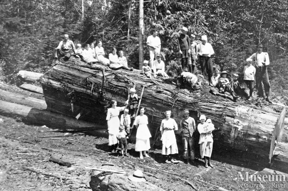 Camp crew and their families are standing on and around a large cedar which was 11 feet in diametre at the butt.