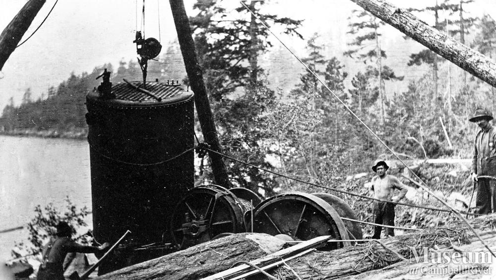 Chris Knutson (head faller) at lower left; the new boiler for the steam donkey is moved into place.