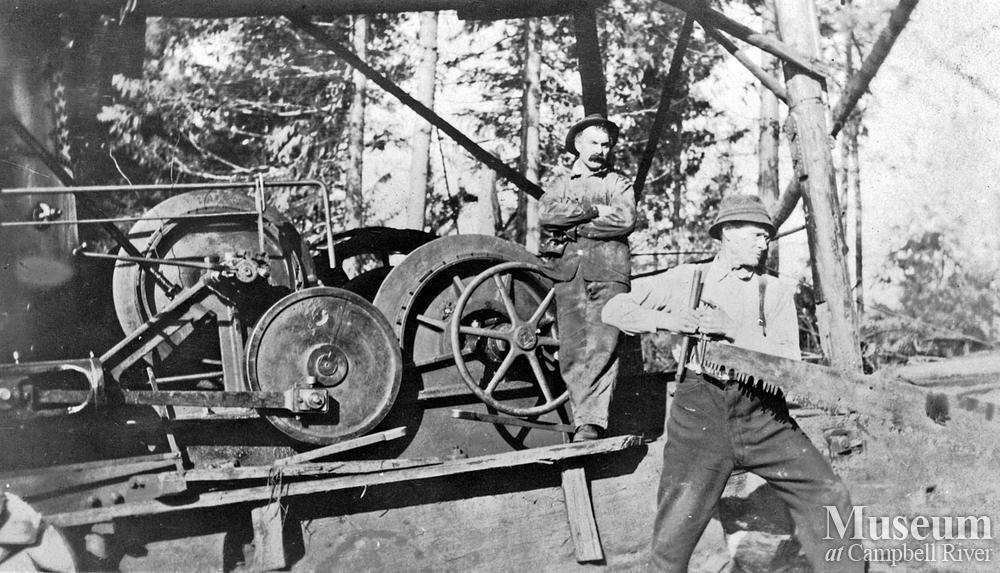 A typical road donkey, a 10 x 15 Vancouver Engineering Works steam donkey, built in 1910. Note the wheel type main friction device. This machine had a capacity of approximately 2 miles 1 1/8" mainline. Louis Larsen (engineer) and John Rohan (wood bucker) pictured with the donkey.