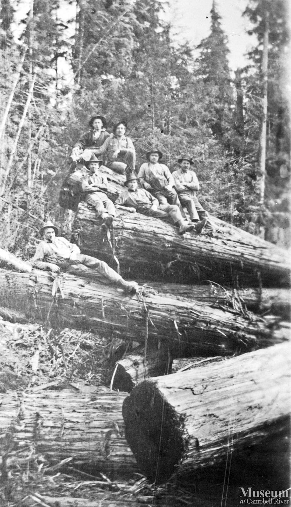 The rigging crew relaxing on a pile of cedar logs. Top row, left to right: Carl Carlson, Carl Aurdahl, Oscar Lind, Julius Sampson; middle row: Harry Brett, Gotfred Sundberg, and Aaron Ericson (high rigger and foreman) at bottom.