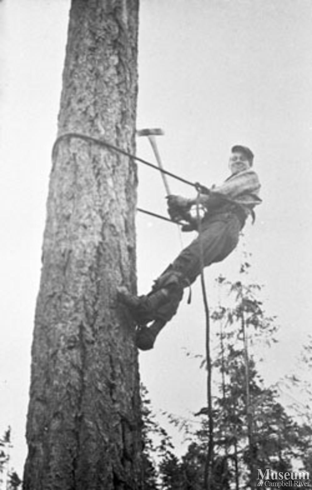 High rigger Gerry Miller rigging a spar tree.