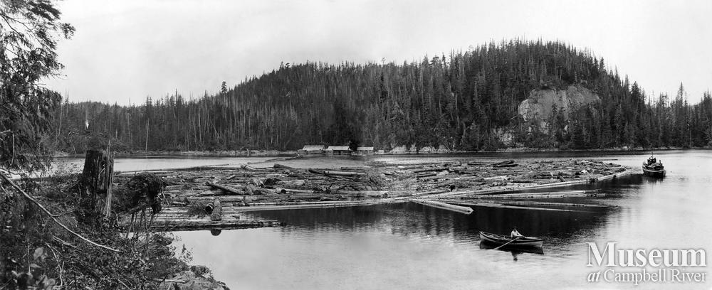 Panorama of the standing boom of Clark and Lyford, Ltd., in the southwest arm of Booker Lagoon, Broughton Island, with Camp 2 on floats in the background. Also note the swing donkey and 108-foot gin pole, with launch 'Kalmor II' at right.