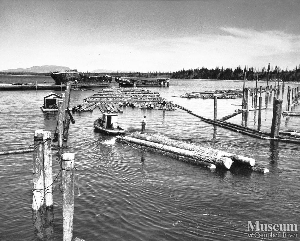 Vic Hampson, the boom foreman, riding a bundle. Iron River Logging experimented with bundled logs for MacMillan Bloedel at this time. It was so successful that it was adapted by other M and B divisions. The strapping was put around the load while it was on the truck, then the bundle was lifted off the truck and lowered into the water where it was attached to other bundles to form a boom.