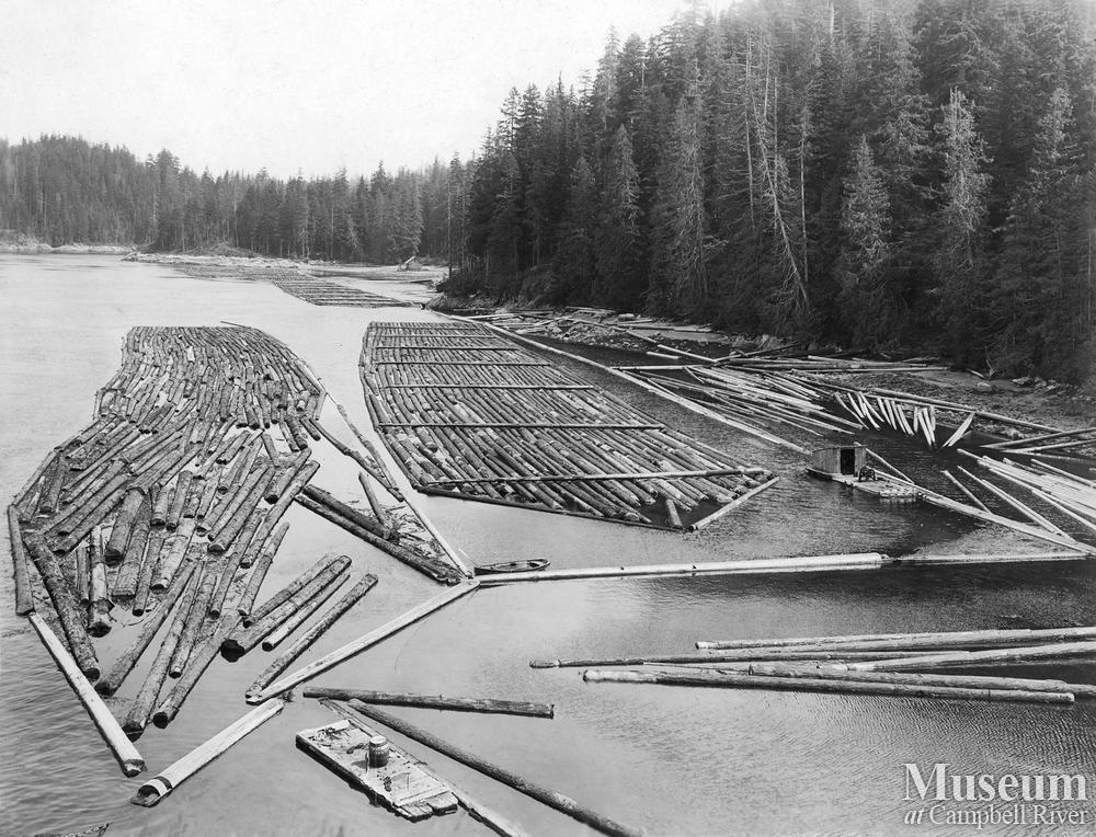 View looking east of log rafts of the British Columbia Mills Timber and Trading Company in Rock Bay - showing one 7-section raft complete with "swifters" and another being assembled between boom stocks; three more completed rafts are in the background.