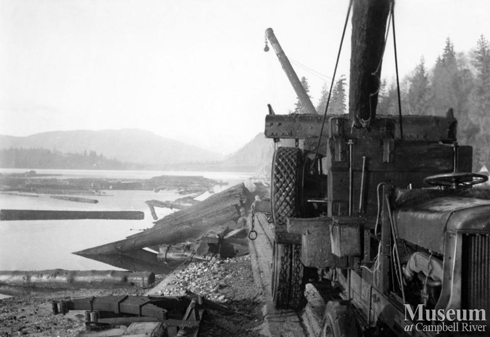 Log dump at Port Neville with logging truck in foreground.