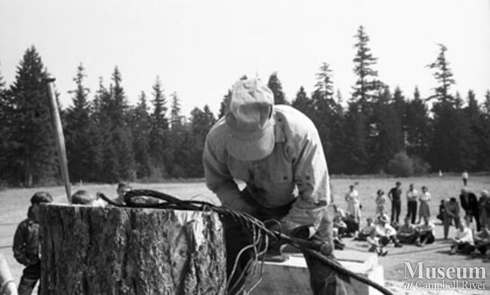 Cable splicing competition at annual logger sports held in Campbell River.