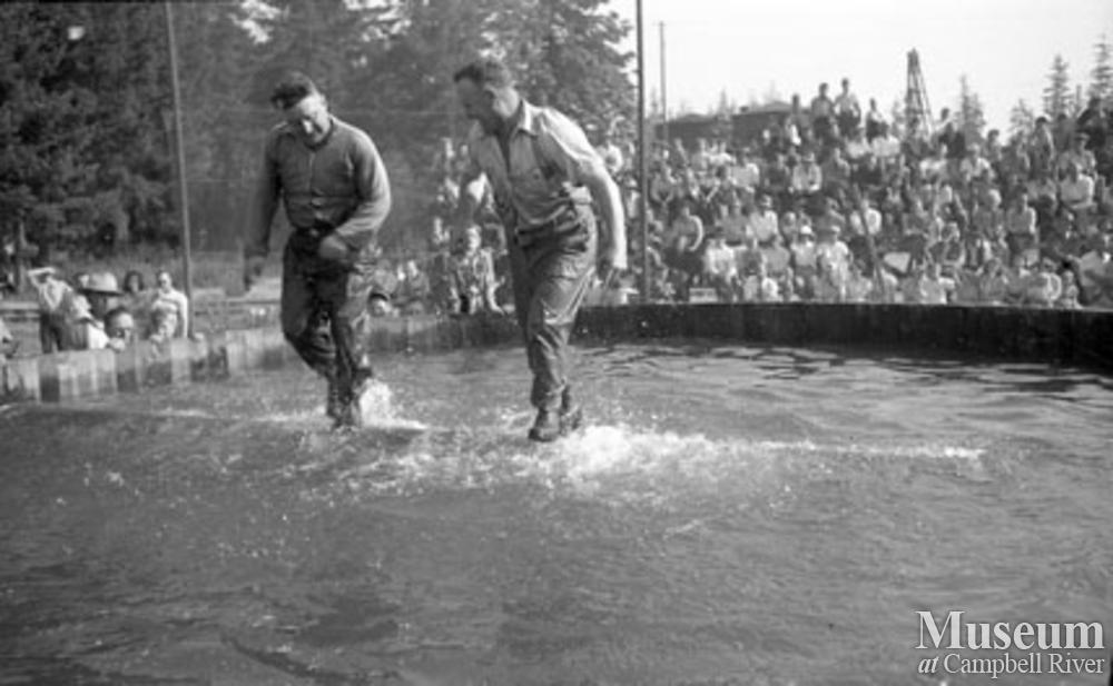 The men's log rolling competition at annual logger sports events held in Campbell River on Labour Day. Jack Baikie on left.