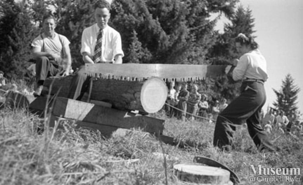 Cross cut saw competition at logger's sports event in Campbell River. Event was held on Labour Day weekend and sponsored by the Kinsmen's Club.