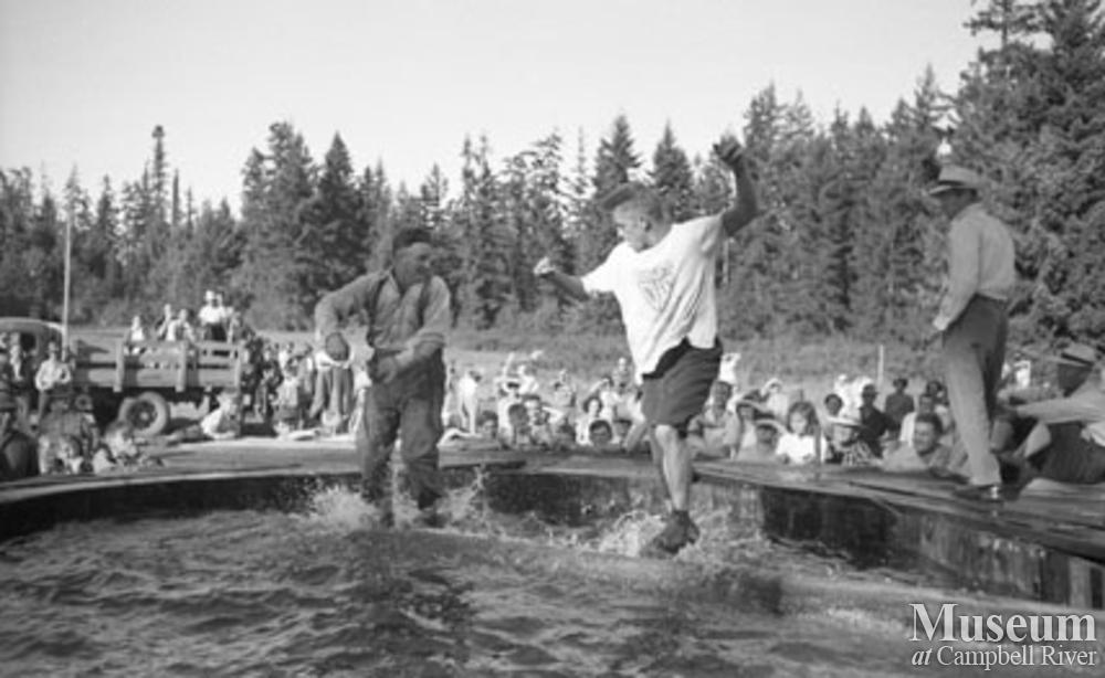 Men's log rolling competition at logger sports event in Campbell River. Jack Baikie in the water and Bill Baikie of Courtenay still on the log. This event was held annual at Lane Field and sponsored by the Kinsmen's club.