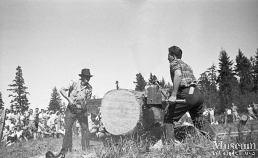 Chainsaw log cutting event at logger sports, Campbell River. Event was annually held on the Labour Day weekend and sponsored by the Kinsmen's Club.
