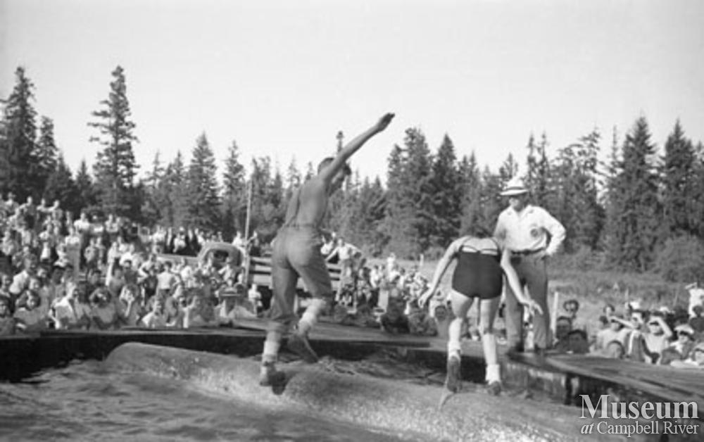 Log rolling event at logger sports, Campbell River. Event was annually held on the Labour Day weekend and sponsored by the Kinsmen's Club.