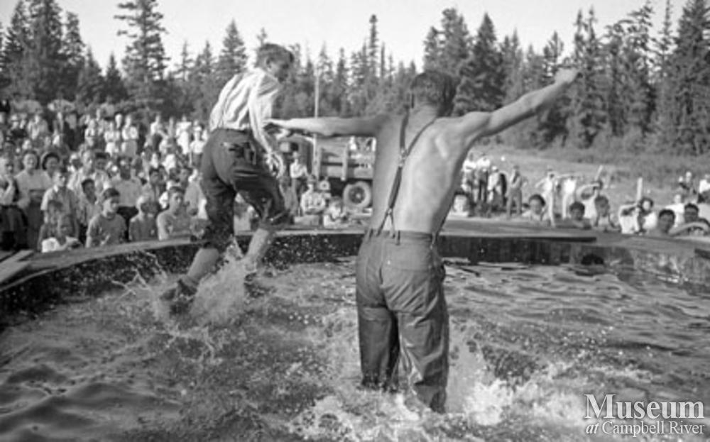 Log rolling event at logger sports, Campbell River. Event was held at Lane Field and sponsored by the Kinsman Club.