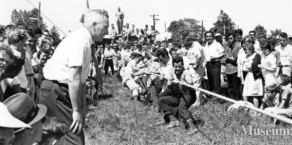 Dr. Richard Murphy referees a tug-of-war game at the Campbell River Logger Sports. Bill Baikie in front of tug-of-war team.
