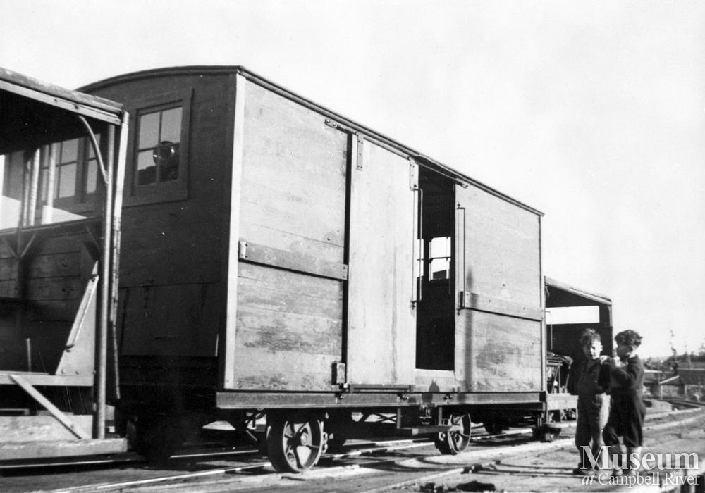 The small freight car at the "Y" at Campbell River Timber, between the big speeder on the left and the little speeder on the right.