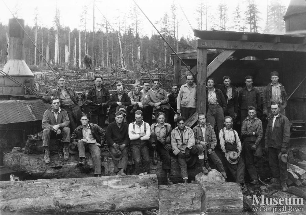 Crew includes mostly local men from the Campbell River area - Dick Atchison (3rd from left at rear), Barney Foley (4th from left at front), and Al Wilms (far left at rear).