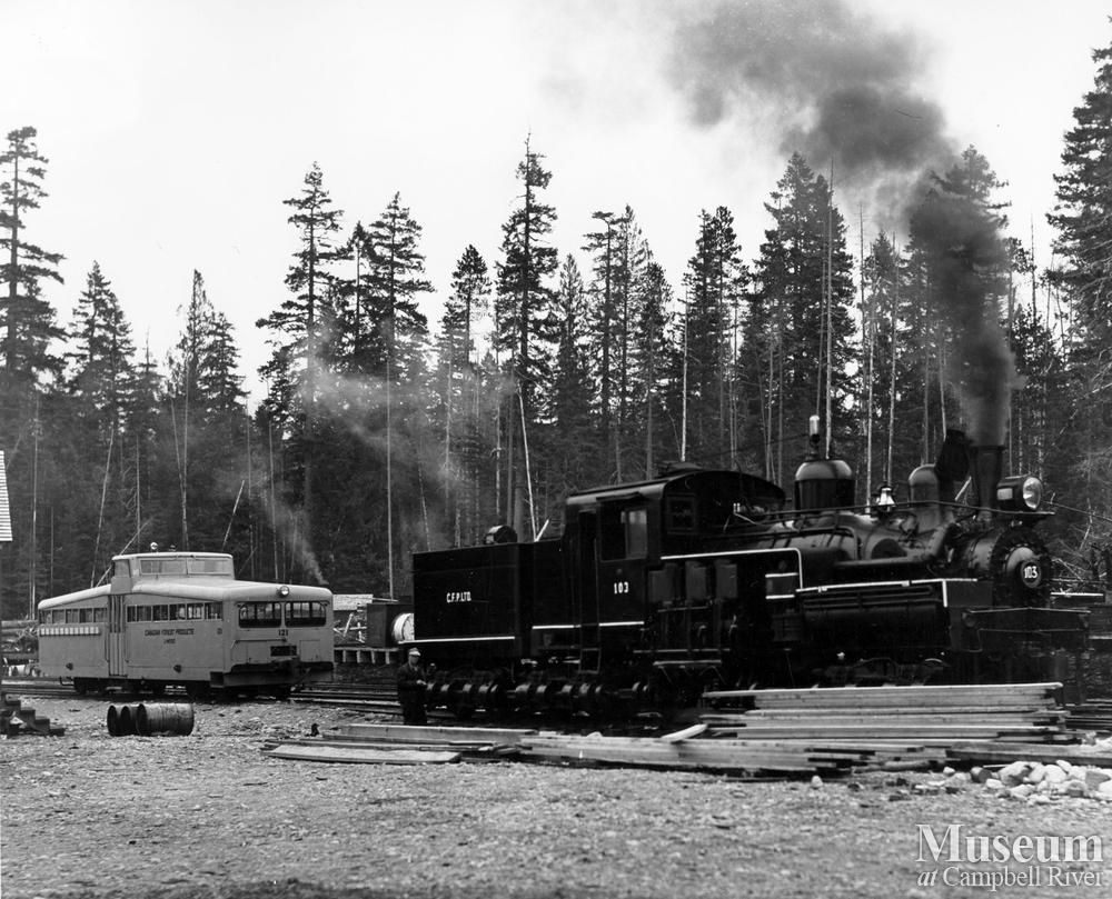 Steam engine 103 and speeder 121 at Woss.