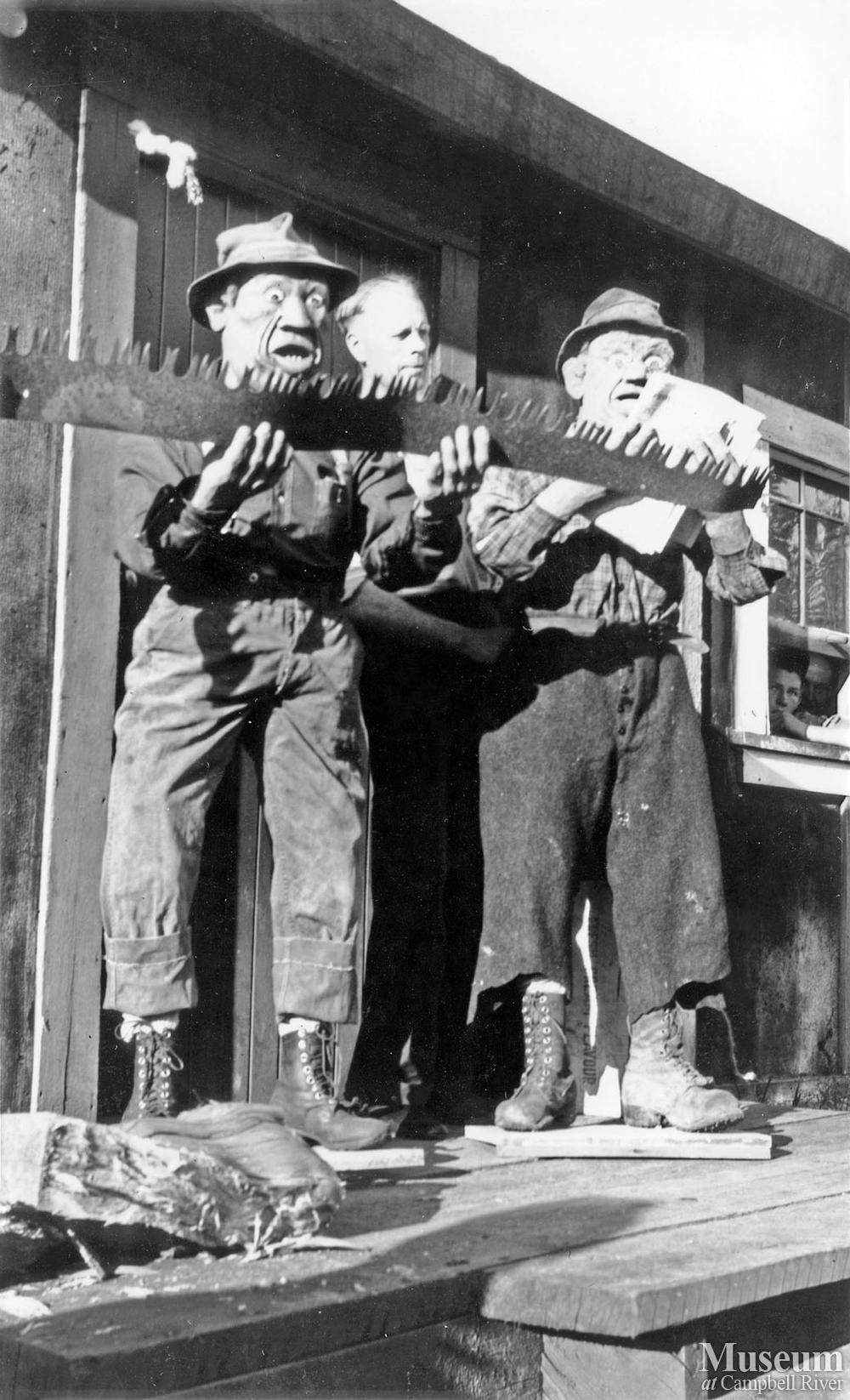 Oscar Hillgren, a saw filer who worked for Elk River Timber Co. with his carved sculpture of an upset filer holding a bent saw.