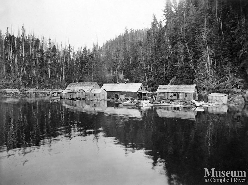 Camp 2, Clark and Lyford, Ltd., on the southwest arm of Booker Lagoon, Broughton Island, B.C.. The camp buildings are on log floats so that when it is desired to move it is only necessary to release the shore lines and tow the whole camp intact to its new location, without delay to the workmen, or expense - except gasoline for the towing launch.