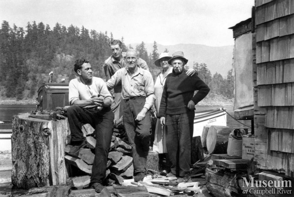 Francis and Amy Barrow (on right) with loggers working for Dick Parker's camp at Trevenon Bay.