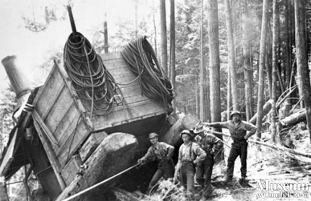Steve Nykolaichuk, Jack and Ken Clark (brothers) with a fourth unidentified man moving the donkey to a new setting at Lull Bay in Knight Inlet. Dot Logging Co. was operated by Clarence and Doug Boardman. This steam donkey (a 10 X12) was restored by the Museum at Campbell River and is now on display out front.