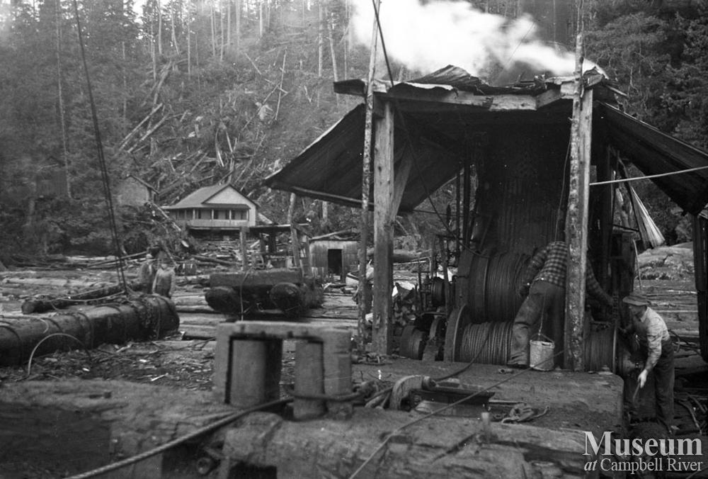 A steam donkey in operation at Lull Bay in Knight Inlet. Dot Logging Co.operation which was owned by Clarence and Doug Boardman. This steam donkey (a 10 X12) was restored by the Museum at Campbell River and is now on display out front.