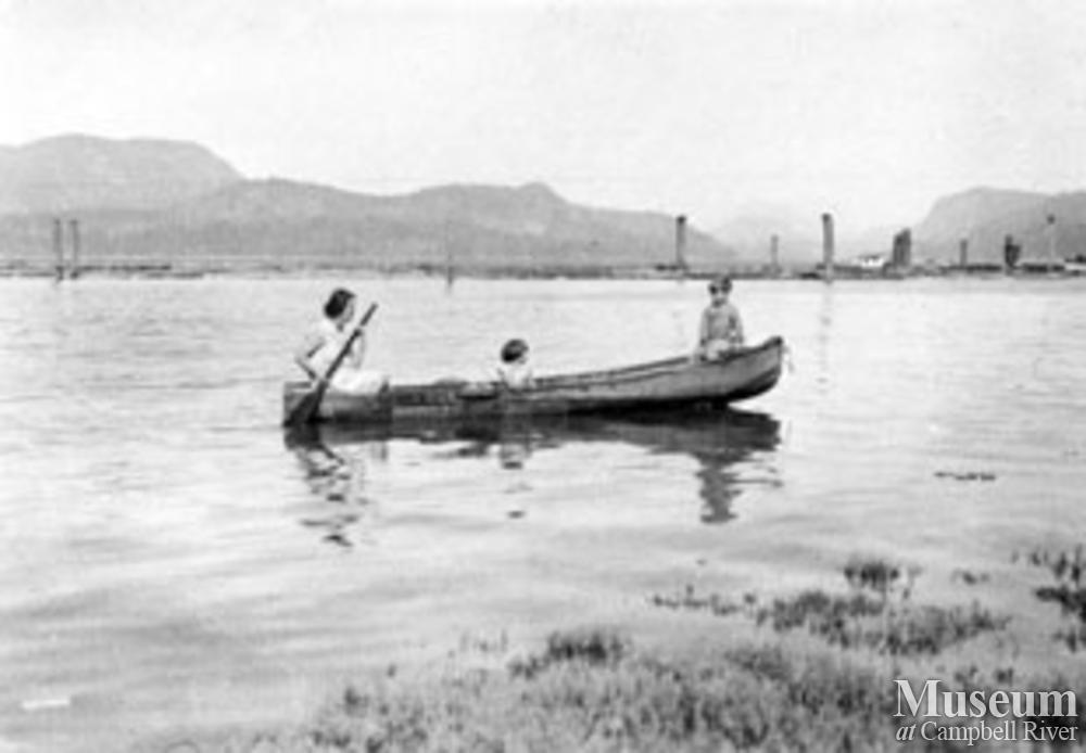 Wilena Thompson and daughter Frances, with another unidentified child, in a dugout canoe near the booming grounds at Elk Bay.
