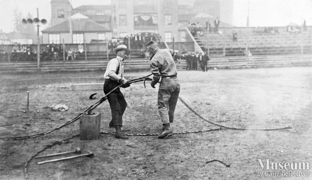 Loggers from Bloedel, Stewart and Welch Menzie's Bay camp, Mike Andrews and George Hulbert, champion splicers competing in a splicing competition at Westminster.