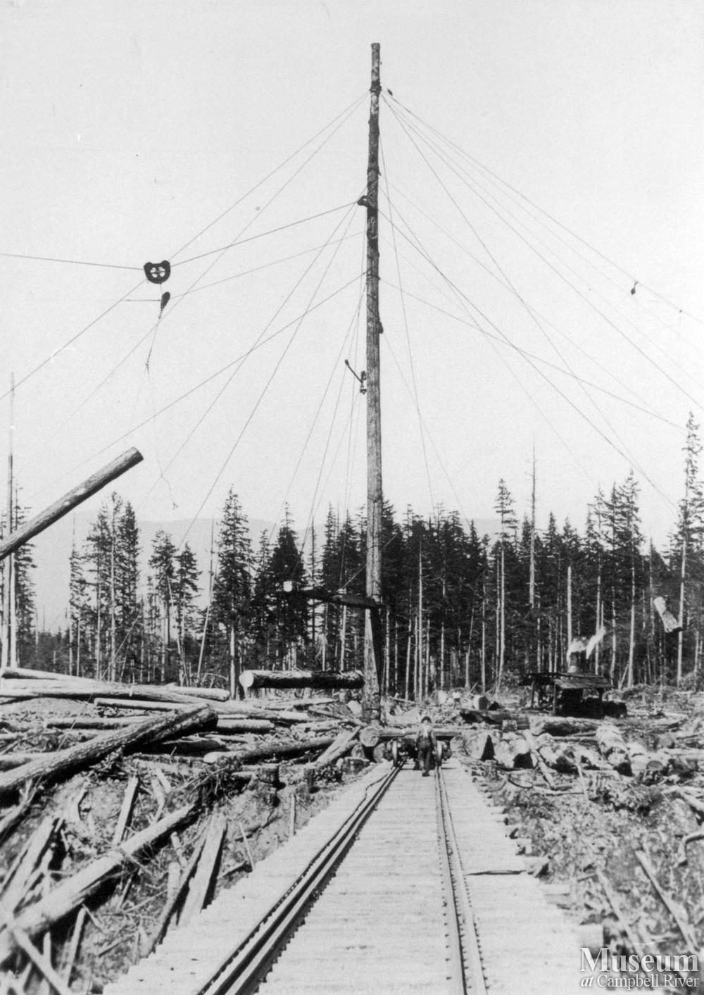 Logging operations at Elk Bay Timber Co.'s camp in the Elk Bay area. Included in photograph is a view of the spar tree and steam donkey (to right).