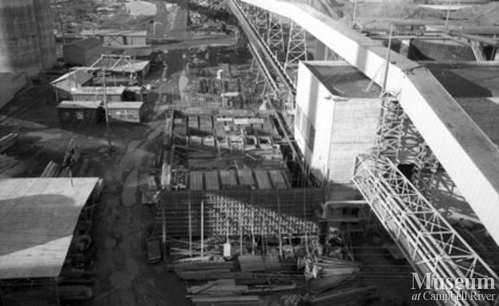 Construction of TMP (Thermomechanical Pulp) plant at the Elk Falls Mill, 1970's. Beside the construction is the original Groundwood Mill and the flume that brought the wood blocks to the mill.