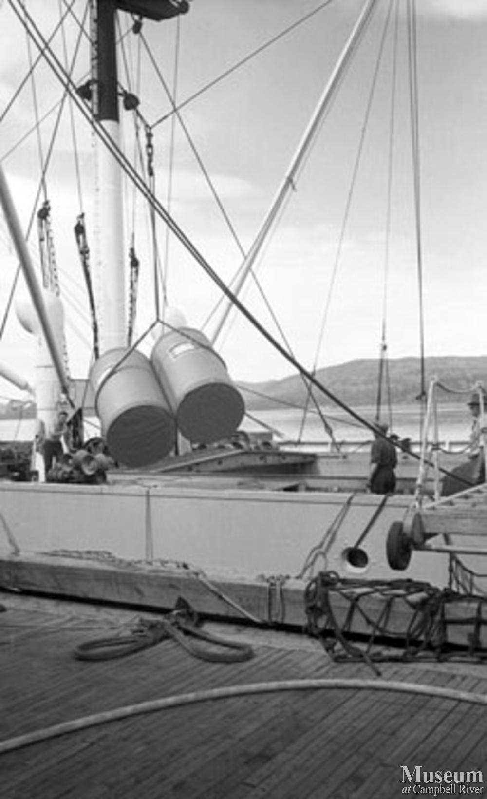 Role of paper manufactured at the Elk Falls Mill being loaded on a freighter.