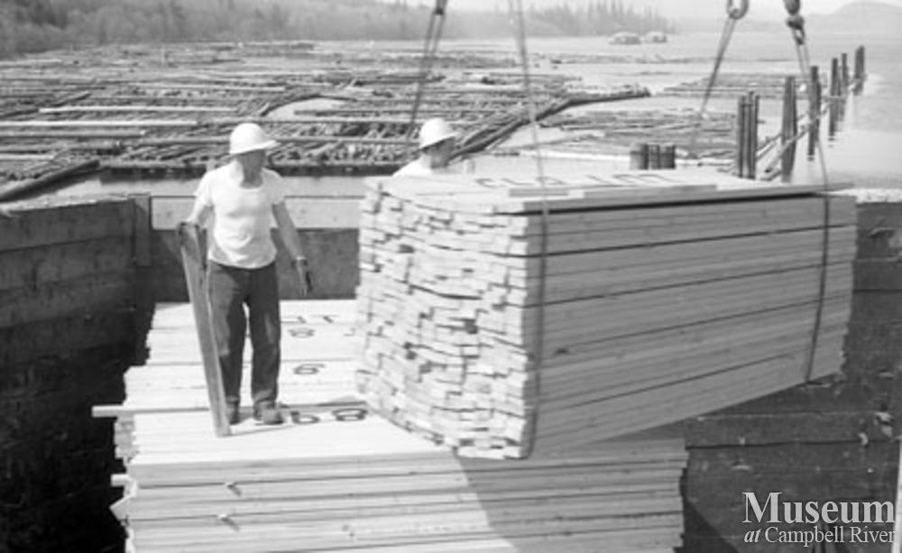 Loading a lumber barge at Duncan Bay. Booming grounds at Duncan Bay are visible in the background.