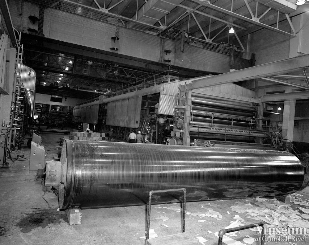 Maintenance on the No. 1 paper machine. Dryer drum in the foreground.