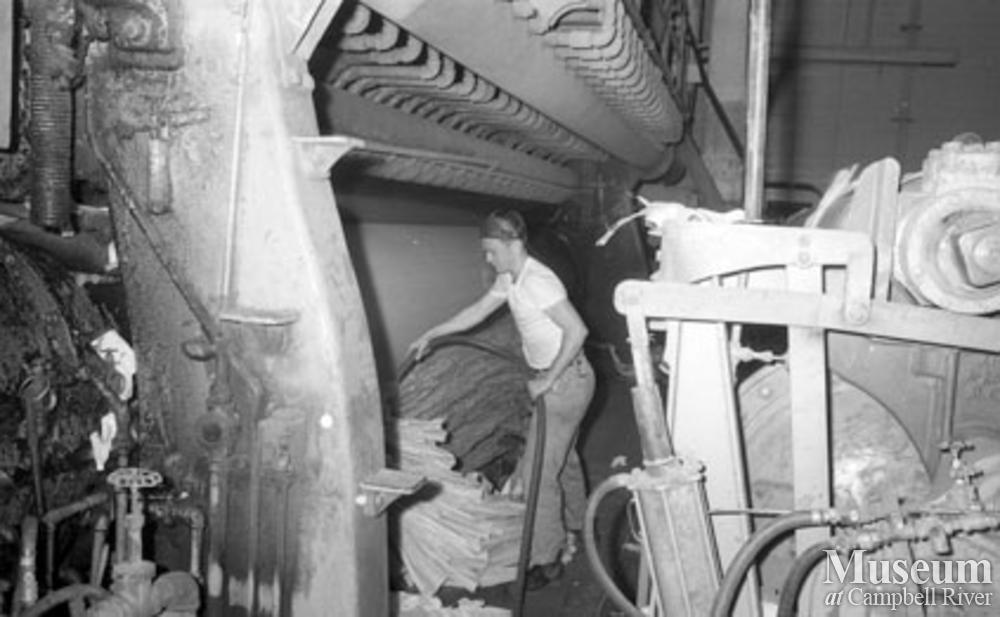 Working on the paper machine at the mill. Dry end of paper machine, blowing the sheet into the beater.