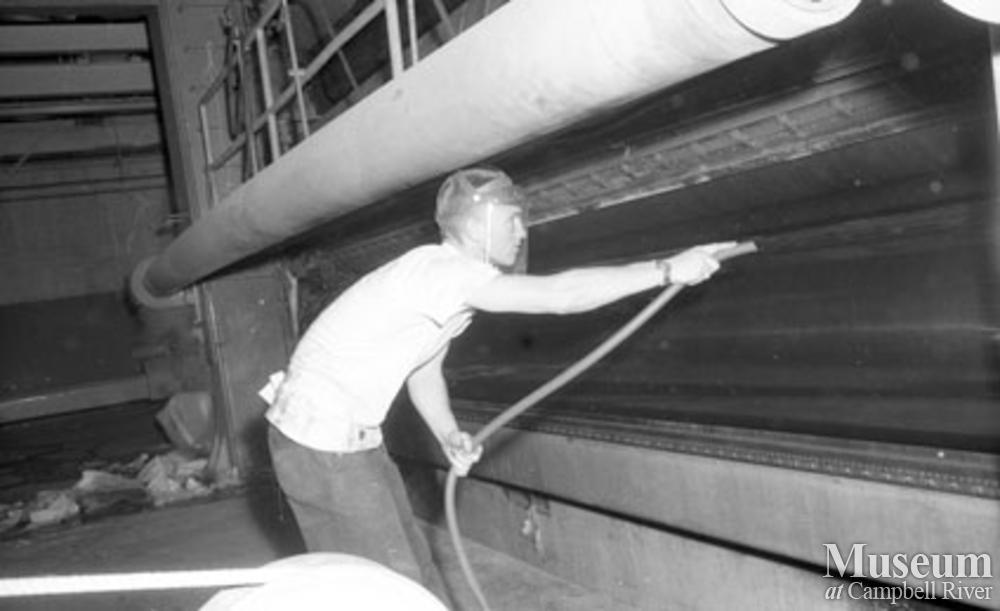 Mill worker getting ready to stack sheet on the calendar stack on the dry end of a paper machine.