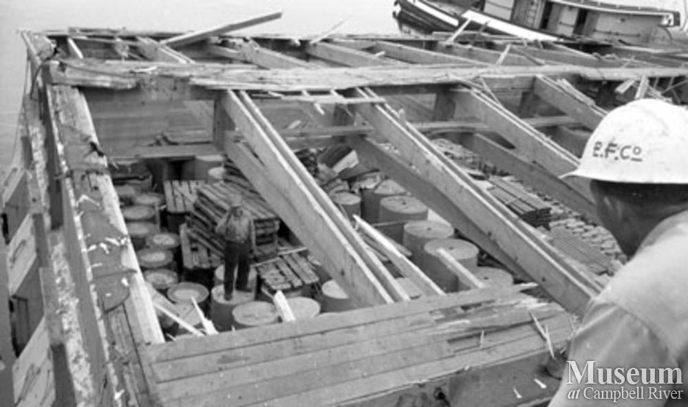 Mill carpenters replacing the roof on the top of a paper barge at low tide.