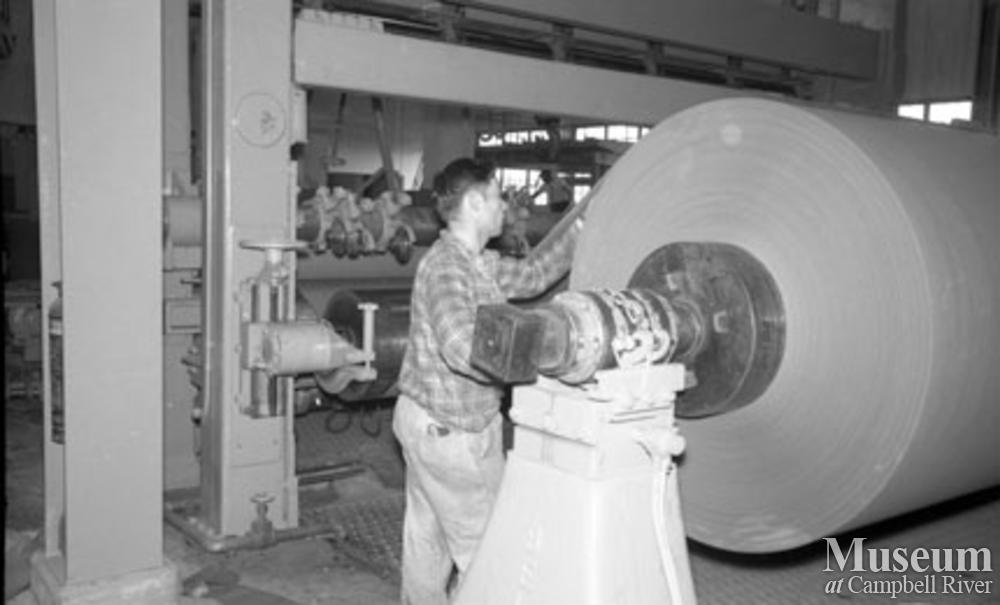 View of the winder on the No. 2 paper machine, Elk Falls Mill.