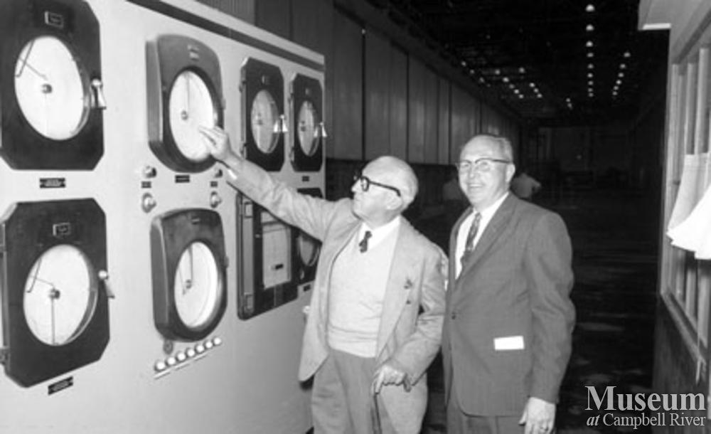 A tour group is taken through the paper making process at the Elk Falls Mill at Duncan Bay. View of the controls for the No. 1 paper machine at the mill. Likely shortly after the mill opened.