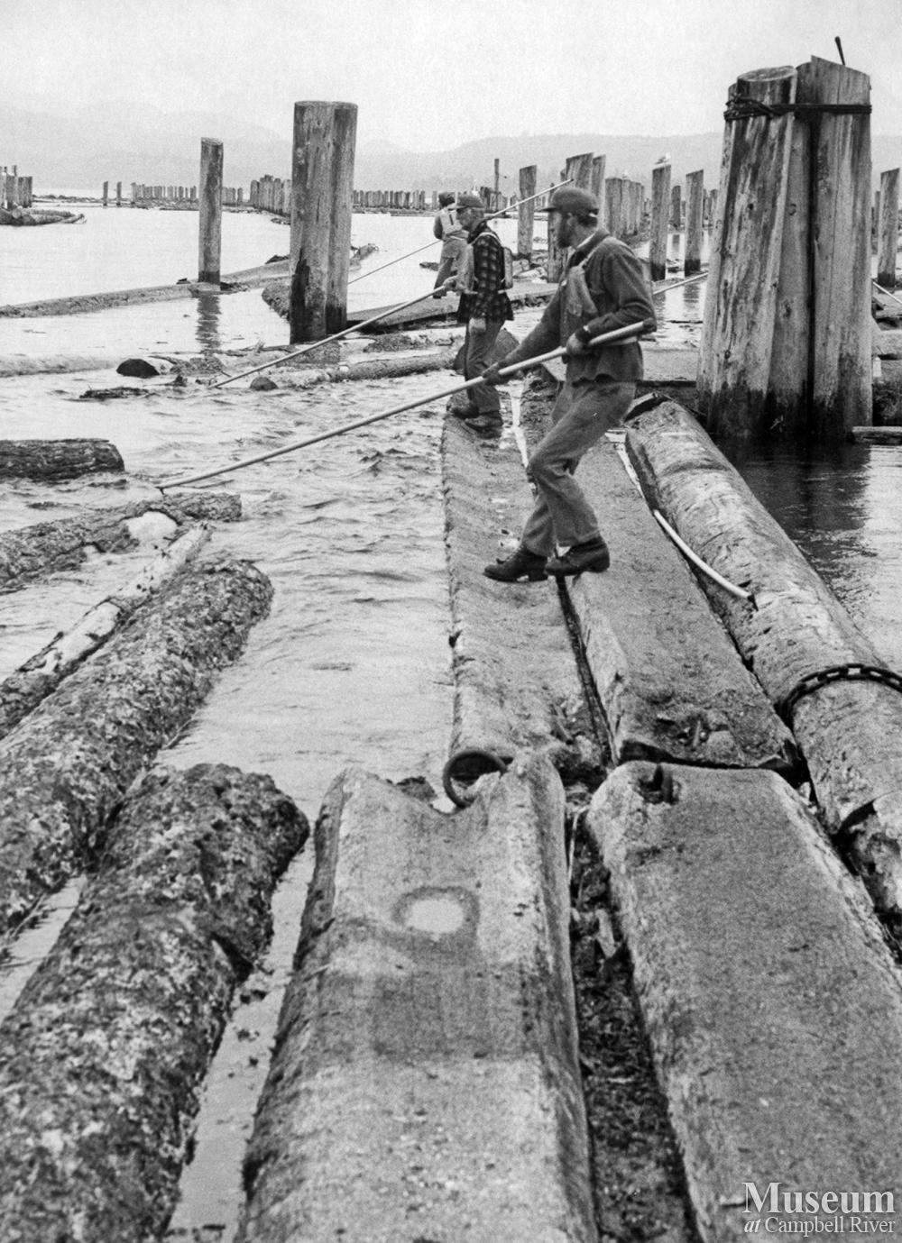 Photograph appeared in the June 16, 1976 issue of the C.R. Upper Islander newspaper with following caption: Sluicing the logs involves grading them as well. Peeler logs for plywood one way, pulp logs the other.