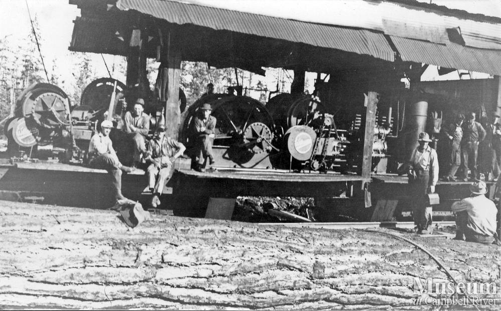 ERT crew members posed beside one of their steam donkey's. Steam donkey is a Willamette.