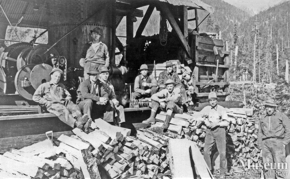 ERT crew members posed beside one of their steam donkey's. Note the stacks of firewood used to fuel the donkey.